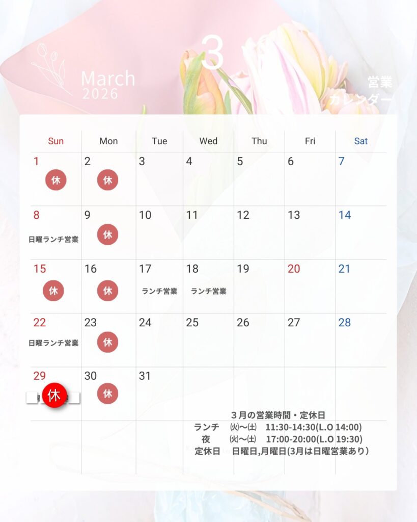 3月は土曜夜営業や日曜ランチ営業もいたします。